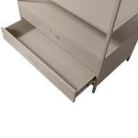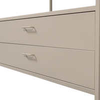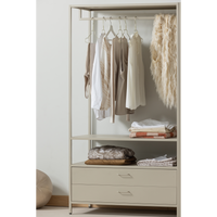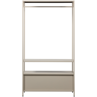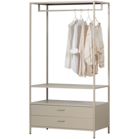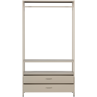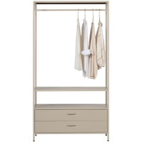 **Stilingas ir nesenstantis dizainas**. Daug vietos saugojimui. Pagaminta iš **metalo** su **smėlio spalvos atspalvio** milteline danga. Atvira drabužių kabykla padeda išlaikyti apžvalgą. Spinta turi du talpius stalčius. Medžiaga: Milteliais dengti metalai užtikrina prabangią išvaizdą ir apsaugą visam gyvenimui. Miltelinė danga suteikia pilną spalvų padengimą ir matinę arba (šiek tiek) blizgią apdailą. Matmenys: Aukštis: **185 cm**. Plotis: **100 cm**. Gylis: **54 cm**. Svoris: 36 kg. Svoris lentynoje: 30 kg. Svoris ant strypo: 26 kg. Priežiūra: Apdorotas metalas lengvai valomas **šiek tiek drėgna šluoste**. Siekiant **saugaus naudojimo**, aukštesnėms nei 50 cm spintoms rekomenduojama montuoti tvirtinimo prie sienos priemones. Pristatymas: Prekė pristatoma vienoje pakuotėje.