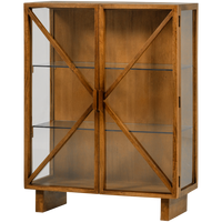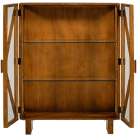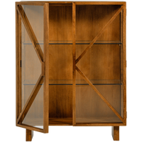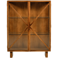 **Elegantiška vitrininė spintelė su stiklu**. Pagaminta iš **mango medienos**. Turi tris duris ir du laikymo skyrius. Medžiaga: **Mango mediena** žinoma dėl šiltos aukso rudos spalvos, tvaraus augimo ir ilgo patvarumo. Kiekviena mango medienos prekė yra **unikali** dėl ryškių rievių ir spalvų niuansų. Matmenys: Aukštis: **132 cm**. Plotis: **100 cm**. Gylis: **44 cm**. Stiklo lentynos storis: 1 cm. Kojos aukštis: 15 cm. Svoris: 53.3 kg. Keliamoji galia (vienai lentynai): **5-7 kg**. Priežiūra: Mango medienos baldus lengva prižiūrėti: valykite **šiek tiek drėgna, švaria šluoste**. Skirta **tik naudojimui viduje**. Siekiant **saugaus naudojimo**, aukštesnėms nei 50 cm spintelėms rekomenduojama montuoti tvirtinimo prie sienos priemones. Pristatymas: Prekė pristatoma **dviejose pakuotėse**.