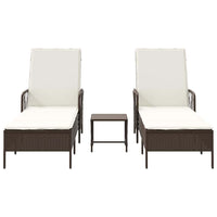 2 vnt. saulės gultai su pagalvėlėmis ir staliuku, rudi, pagaminti iš poliratanas.
