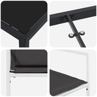- Patvarus Milteliniu Būdų Dengtas Rėmas: Pagamintas iš milteliniu būdu dengto plieno rėmo, komplektas pasižymi tvirtumu ir stabilumu, atspariu kasdieniam naudojimui ir įvairioms oro sąlygoms. Jo tvirta konstrukcija užtikrina struktūrinį vientisumą, reikalingą maloniems valgymo įspūdžiams po atviru dangumi.