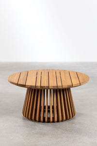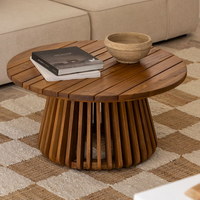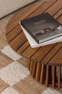 Apvalus kavos staliukas MDEMU – natūralios akacijos masyvas be lakų, drąsi centrinė lamelių koja ir išraiškinga tekstūra.