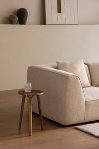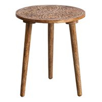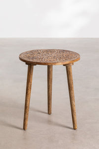 Apvalus mango medžio pagalbinis staliukas NDANE su lakuota apdaila ir mandalos raižiniu – boho akcentas namams.