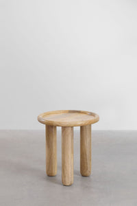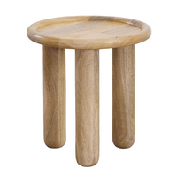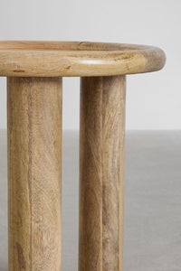 Apvalus mango medžio pagalbinis staliukas ORIENA – natūrali apdaila, platus stalviršis, trys tvirtos kojos.
