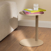 Apvalus šoninis staliukas YNEONA Ø40 iš nerūdijančio plieno – industrinio šiko estetika moderniame formate. Kompaktiškas, lengvai perkeliamas, su apsauginėmis veltinio pagalvėlėmis pagrinde.