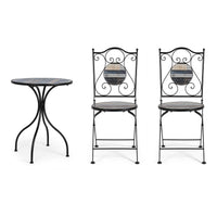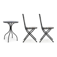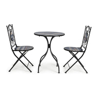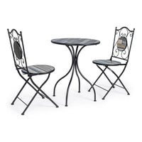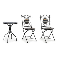 Komplektas pagamintas iš aukštos kokybės plieninio rėmo, skirtas naudoti lauke, padengto epoksidiniu milteliniu būdu. Stalviršis ir kėdžių sėdynės yra pagamintos iš keramikos, kas užtikrina ilgaamžiškumą ir lengvą priežiūrą. Kėdės yra sulankstomos, todėl užima mažai vietos, kai nereikalingos. Komplektas idealiai tinka 2 žmonėms.