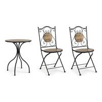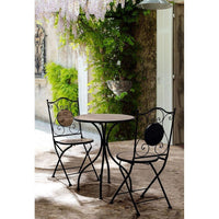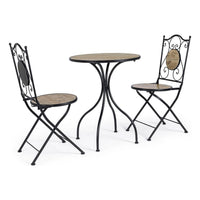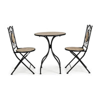 Komplektas pagamintas iš aukštos kokybės plieninio rėmo, skirtas naudoti lauke, padengto epoksidiniu milteliniu būdu. Stalviršis ir kėdžių sėdynės yra pagamintos iš keramikos, kas užtikrina ilgaamžiškumą ir lengvą priežiūrą. Kėdės yra sulankstomos, todėl užima mažai vietos, kai nereikalingos. Komplektas idealiai tinka 2 žmonėms.