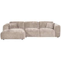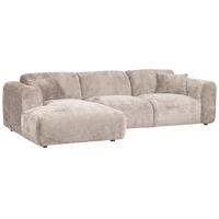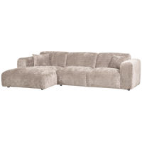 Šezlongas kairėje, Cloud kolekcijos, Natural spalvos, aptrauktas švelniu šeniliniu audiniu. Itin patogi forma, su dekoratyvinėmis pagalvėlėmis, puikiai tinka atsipalaidavimui.