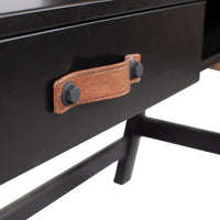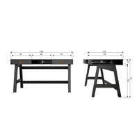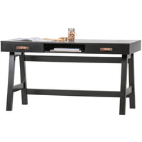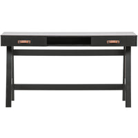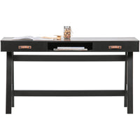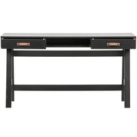 Rašomasis stalas DIAN, juodas – šiuolaikiškas ir šiek tiek griežto stiliaus; 2 stalčiai su odinėmis rankenėlėmis ir ilga atvira niša palaiko tvarką ant stalo.