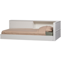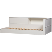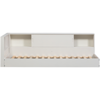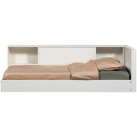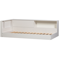 **Moderni ir nesenstanti kampinė lova**. Pagaminta iš pušies medienos, apdailinta **balta** spalva. Turi **integruotą laikymo vietą**. Čiužinio dydis: 90x200 cm. Medžiaga: Šlifuota pušies mediena. Matmenys: Aukštis: **67 cm**. Plotis: **215 cm**. Gylis: **118 cm**. Svoris: 38,5 kg. Čiužinio dydis: 90x200 cm. Keliamoji galia: **150 kg**. Priežiūra: Apdorota pušies mediena lengvai valoma **šiek tiek drėgna šluoste**. Drėgnas dėmes rekomenduojama iškart nusausinti.