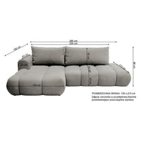 Kampinė sofa OMBO – tai stilingas ir funkcionalus baldas, puikiai tinkantis šiuolaikiškam interjerui. Šios sofos aksominis audinys Salvador yra ne tik malonus liesti, bet ir lengvai prižiūrimas dėl hidrofilinių savybių. Modernūs užapvalinti dizaino elementai suteikia jaukumo ir elegancijos. Sofa turi integruotą miego funkciją, leidžiančią ją lengvai transformuoti į patogią lovą su erdviu 130x215 cm paviršiumi – puikus sprendimas svečių nakvynei. Poilsio dėžė suteikia vietos tvarkingam daiktų laikymui, o universalus dizainas leidžia pasirinkti dešinės arba kairės pusės variantą, pritaikant sofą pagal jūsų poreikius.