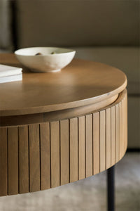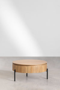 Apvalus kavos staliukas ADUMIA iš mango medžio su paslėpta viso stalviršio stalčiaus erdve ir reguliuojamais padukais – elegancija ir funkcionalumas kasdienai.