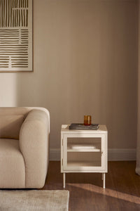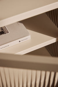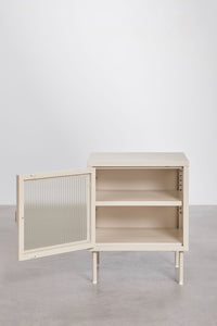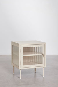 PVETURI – kavos staliukas su reljefinėmis stiklo durelėmis ir viduje reguliuojama lentyna; derina retro ir modernų stilius.