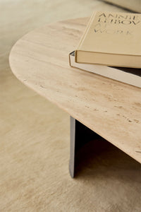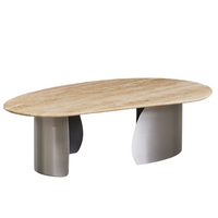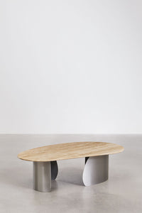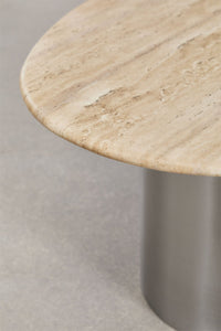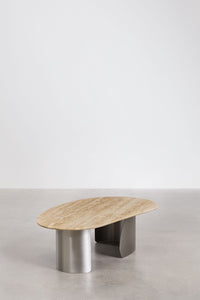 Kavos staliukas VMILA 120×70 iš travertino ir nerūdijančio plieno – organiškų, aptakių formų akcentas moderniam interjerui. Matinis travertino stalviršis ir elegantiškos lenktos kojos suteikia lengvumo bei išskirtinumo.
