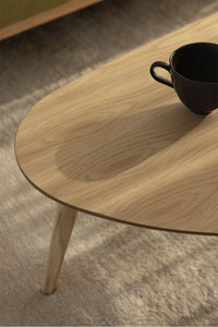 Kavos staliukas YMAOA iš MDF plokštės ir ąžuolo – natūralus akcentas svetainei. Ovalo forma, subtiliai lenktos kojos ir šiltas atspalvis kuria jaukią atmosferą. Platus paviršius patogiai talpina žurnalus, dekoracijas ar puodelius. Lengvas, patvarus ir pritaikomas pagal poreikį. Paprastas, modernus dizainas suteikia erdvei lengvumo.