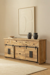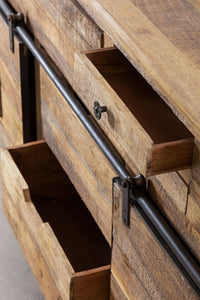 KIRVETURI iš mango medienos – derina stalčius ir stumdomas duris, suteikdama daug vietos laikymui. Natūralus paviršius su metalo detalėmis kuria industrinį charakterį. Tinka svetainei ar prieangio zonai.