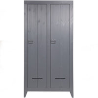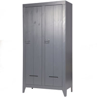 Spinta Kluis, pušis, plieninė pilka. Talpi spinta su dvejomis durimis ir gausiomis lentynomis. Šepečiu išryškinta tekstūra suteikia gyvumo.