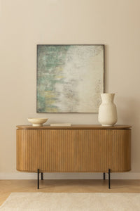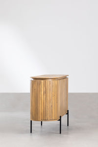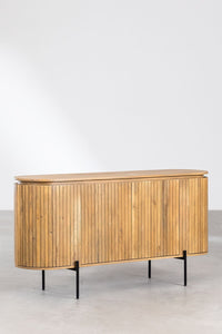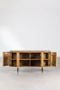 Komoda ADUMIA iš mango medžio – talpi ir stilinga, su keturiomis durelėmis ir geležinėmis kojelėmis.