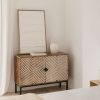 Komoda ANUOLA iš mango medžio – rankų darbo baldas su geometriniais raštais, suteikiantis boho stiliaus išskirtinumo.
