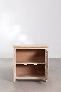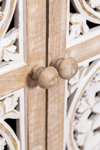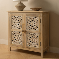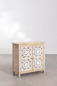 Komoda AVUTI iš mango medžio su matiniu pikliuotu efektu – boho-chic charakteris, simetriški fasado motyvai ir talpios lentynos viduje.