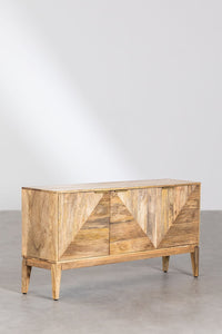 Komoda BORKU DANDIA – mango medis, mosiškos geležies rankenėlės, 4 durys su lentynomis, tvarka be vizualaus triukšmo.