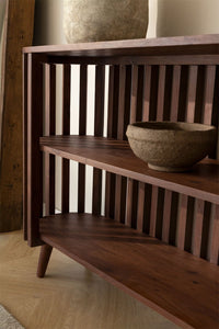 Komoda DLAKEA 120x35 cm iš akacijos; atviras lentynų išdėstymas, lenktos lamelės, matinis akrilinis lakas, reguliuojamos kojelės ir grindų apsauga.