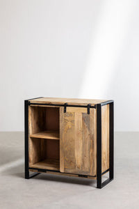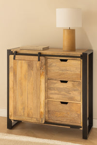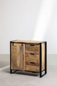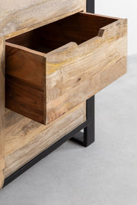 Komoda KKESUA iš mango medienos ir metalo – pramoninio stiliaus baldas su stumdomomis durimis ir stalčiais.