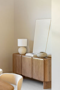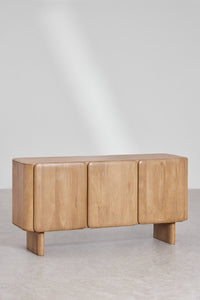 Komoda MDANEO iš mango medžio – minkštų linijų, su 3 durimis ir 6 erdviomis nišomis; magnetinis užsidarymas ir soft-close vyriai, stabilios kojos su guminėmis pagalvėlėmis, anti-tip apsauga.