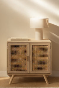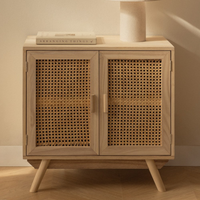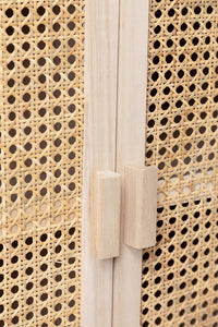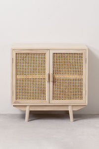 RELDU komoda su rataniniais fasadais – paulovnijos medžio lengvumas ir natūralus ratanas sukuria šiltą, šiuolaikinį akcentą mažesnėms erdvėms.
