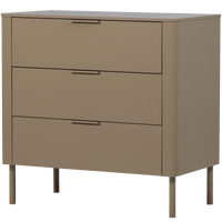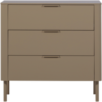 Komoda su trimis soft-close stalčiais, pagaminta iš FSC pušies, purvo spalvos, su užapvalintais kampais ir moderniu siluetu.