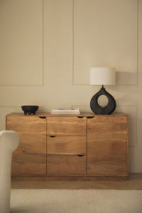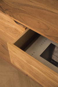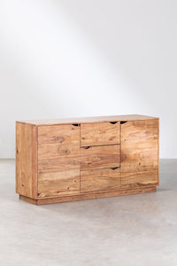 Komoda TIRVETU iš akacijos medienos – minimalistinio dizaino baldas, puikiai tinkantis įvairaus stiliaus svetainėms. Asimetriškai išdėstyti įpjovimai atlieka rankenėlių funkciją, o magnetinis uždarymas užtikrina patogų naudojimą.