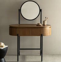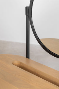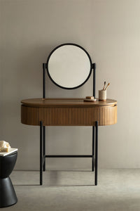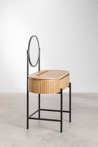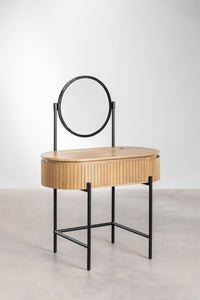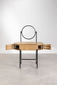 Šis neįtikėtinas kosmetinis staliukas iš mango medienos - tai unikalus baldas, kuriame dera natūralus medienos grožis ir elegantiškos geležinės kojos. Ryškiausias akcentas – apvalus veidrodis, įrėmintas geležiniu rėmu, kuris suteikia staliukui ne tik stabilumo, bet ir romantikos bei elegancijos. Idealiai tinka naudoti miegamajame ar grožio zonoje.