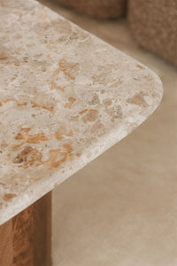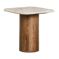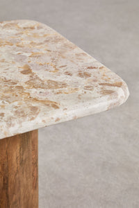 Kvadratinis kavos staliukas MRUERVAME – plonas marmuro stalviršis ir tvirta cilindrinė mango medžio bazė kuria kontrastingą, architektūrišką įspūdį.
