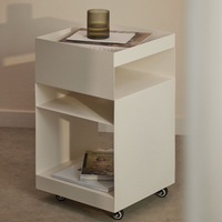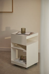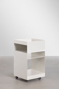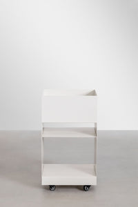 RIRVETU – kvadratinis staliukas ant ratukų su keliais plieniniais lygiais; mobilus, talpus ir patvarus.