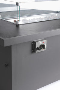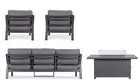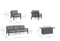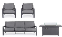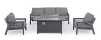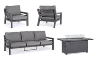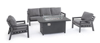 HENDRIX CHARCOAL – tai išskirtinis 4 dalių lauko baldų komplektas su centriniu židiniu, skirtas sukurti jaukią atmosferą terasoje ar sode. Komplektą sudaro trivietė sofa, du patogūs foteliai ir didelis kvadratinis stalas su stikliniu paviršiumi bei dujiniu židiniu. Stalas dekoruotas keramikos efektą imituojančiu spaudiniu, o židinys apsaugotas grūdinto stiklo gaubtu.