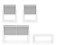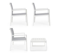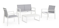 Lengvas ir stilingas KALLEN WHITE 4 dalių lauko baldų komplektas puikiai tinka tiek balkonui, tiek kiemui. Balto aliuminio rėmas su pilku tekstileno audiniu suteikia šiuolaikišką išvaizdą, o ergonomiški atlošai ir lengvai valoma medžiaga užtikrina praktiškumą kasdieniam naudojimui.
