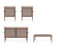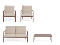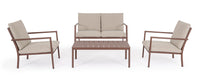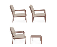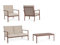 Šiltų atspalvių lauko baldų komplektas KONNOR BARN yra puikus pasirinkimas tiek šiuolaikiškai, tiek natūraliai aplinkai. Komplektą sudaro trivietė sofa, du foteliai ir kavos staliukas. Karamelinės spalvos aliuminio rėmas ir šviesios pagalvėlės iš olefino audinio užtikrina komfortą bei ilgaamžiškumą. Stalo kojas reikia surinkti.