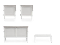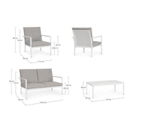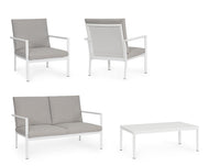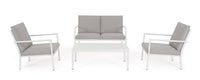 Šiuolaikiškas lauko baldų komplektas KONNOR WHITE – tai 4 dalių komplektas terasai ar sodui. Jį sudaro trivietė sofa, du patogūs foteliai ir kavos staliukas. Baltos spalvos aliuminio konstrukcija derinama su šviesiomis olefino pagalvėlėmis, kurios užtikrina komfortą ir ilgaamžiškumą. Stalo kojas reikia surinkti.