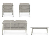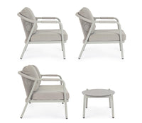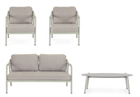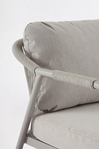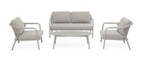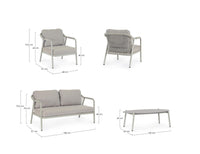 Šviesus ir modernus MIRAVET SATURN lauko baldų komplektas suteiks jaukumo ir išskirtinumo jūsų terasai ar kiemui. Komplektą sudaro trivietė sofa, du patogūs foteliai ir kavos staliukas su sinteruoto akmens stalviršiu. Šviesi konstrukcija derinama su pilkšvais atspalviais ir vandeniui atspariomis pagalvėlėmis. Staliuko kojas reikia surinkti.