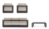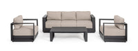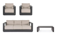 Stilingas ir erdvus lauko baldų komplektas MOSES ANTRACITE – puikus pasirinkimas terasai ar sodui. Komplektą sudaro trivietė sofa, du platūs foteliai ir kavos staliukas. Antracito spalvos aliuminio konstrukcija yra atspari aplinkos veiksniams, o minkštos pagalvėlės iš olefino audinio užtikrina maksimalią patogumo patirtį. Reguliuojamos stalo kojelės suteikia stabilumo ant nelygių paviršių.