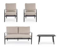 Modernus ir stilingas 4 dalių lauko baldų komplektas NEBULA ANTRACITE – idealus pasirinkimas terasai ar sodui. Komplektą sudaro dvivietė sofa, du patogūs foteliai bei kavos staliukas. Tamsaus antracito spalvos aliuminio konstrukcija ne tik atrodo elegantiškai, bet ir yra itin atspari lauko sąlygoms. Minkštos, nuimamos pagalvėlės pagamintos iš vandeniui atsparaus olefino audinio užtikrina komfortą ir paprastą priežiūrą.