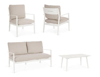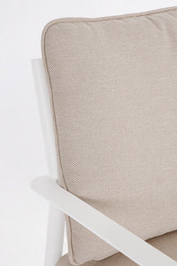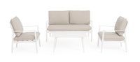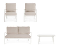 Stilingas ir modernus 4 dalių lauko baldų komplektas NEBULA VAPOR – puikus pasirinkimas lauko poilsiui. Komplektą sudaro dvivietė sofa, du patogūs foteliai ir kavos staliukas. Baltos spalvos milteliniu būdu dažyta aliuminio konstrukcija atspari aplinkos poveikiui, o nuimamos pagalvėlės iš olefino audinio užtikrina komfortą ir lengvą priežiūrą.