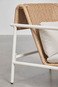 Lauko fotelis RATANO su porankiais yra išskirtinio dizaino baldas, kviečiantis regeneruojančiam poilsiui jūsų sode. Aliuminio konstrukcija su matiniu baltos spalvos pynimu puikiai dera prie natūralios aplinkos. Atlošas puoštas rankų darbą primenančiu sintetinio ratano raštu, suteikiančiu boho stiliaus prieskonį. Ergonomiškai išlenktas rėmas sukurtas taip, kad kojos ilsėtųsi natūralioje padėtyje. Minkštos pagalvės, aptrauktos vandeniui atspariu audiniu, užtikrina jaukumą bet kokiomis oro sąlygomis. Šis fotelis yra lengvas, stabilus ir aprūpintas polipropileno apsaugomis ant kojų, kurios apsaugo jūsų terasos grindis nuo įbrėžimų.