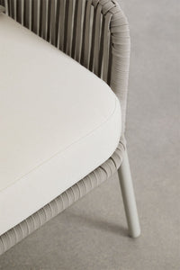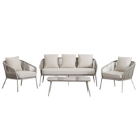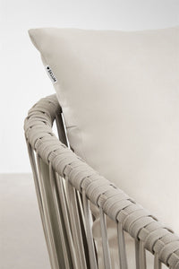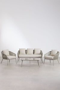Modernus 4 dalių lauko baldų komplektas ARHIZA, su dviviete sofa, dviem foteliais ir kavos staliuku. Aliuminio konstrukcija ir pintos virvės sukuria lengvą ir elegantišką formą. Puikiai tinka terasai ar sodui, kur ieškoma tiek stiliaus, tiek funkcionalumo. Grūdinto stiklo stalviršis – praktiškas ir stilingas pasirinkimas.