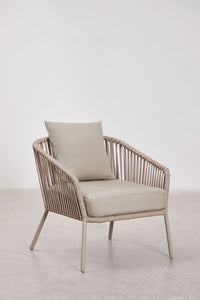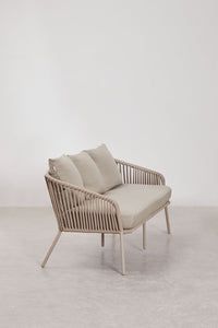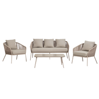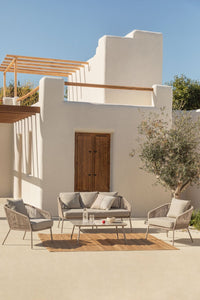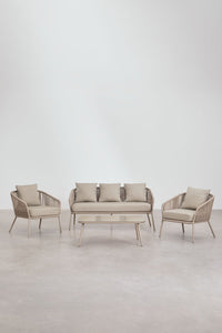 Modernus 4 dalių lauko baldų komplektas ARHIZA, su dviviete sofa, dviem foteliais ir kavos staliuku. Aliuminio konstrukcija ir pintos virvės sukuria lengvą ir elegantišką formą. Puikiai tinka terasai ar sodui, kur ieškoma tiek stiliaus, tiek funkcionalumo. Grūdinto stiklo stalviršis – praktiškas ir stilingas pasirinkimas.