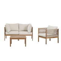 Kompaktiškas ir funkcionalus lauko baldų komplektas RENARO S – tai 4 dalių rinkinys, kurį sudaro 2 modulinės sofos dalys su porankiais, fotelis ir stilingas kavos staliukas. Rėmas pagamintas iš natūralios akacijos medienos, kuri užtikrina tvirtumą ir elegantišką išvaizdą. Atlošai ir šonai apipinti virve, kuri suteikia subtilų dekoratyvinį akcentą. Pagalvėlės pagamintos iš poliesterio ir užpildytos putų bei pluošto mišiniu – užtikrina minkštumą ir atsparumą drėgmei. Puikus pasirinkimas mažesnėms terasoms ar balkonams – sukurkite jaukią poilsio erdvę po atviru dangumi.