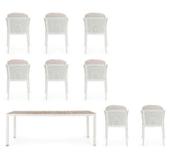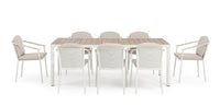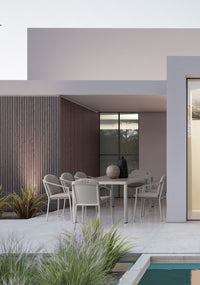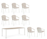 ULISES VAPOR – elegantiškas lauko valgomojo komplektas, kurį sudaro erdvus stalas ir 8 patogios kėdės. Šiuolaikiškas dizainas, patvarios medžiagos ir subtilios formos suteiks jūsų terasai ar kiemui rafinuotumo.