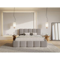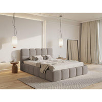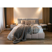 Miegamojo lova SOFTY, šviesiai pilkos spalvos (Legend 03 bouclé) – subtilus ir modernus pasirinkimas, dekoruotas kvadratiniais segmentais galvūgalyje. Metalinis pakeliamas rėmas su dujiniais pakėlėjais ir 34 lamelėmis patikimai laiko čiužinį ir suteikia prieigą prie talpios dviejų kamerų dėžės. Modelis taip pat gaminamas 200×200 cm dydžio.