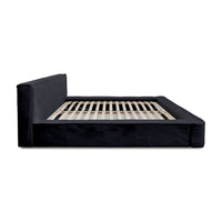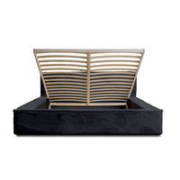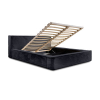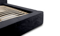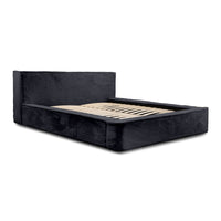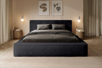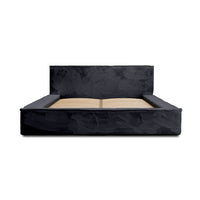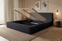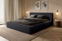 Miegamojo lova JAMES, Lapit 19 – elegantiška lova juodos spalvos audiniu. Premium klasės „Lapit“ audinys pasižymi neįprastu tankumu ir švelniu paviršiumi, o jo struktūra be blizgesio suteikia interjerui prabangos įspūdį. Lova turi dujinius pakelėjus ir talpią dėžę patalynei.