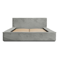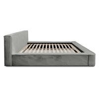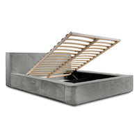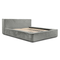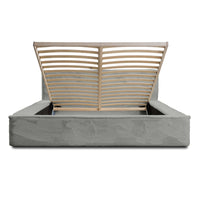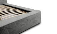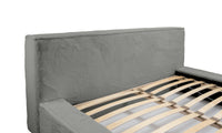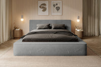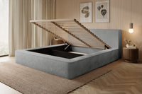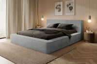 Miegamojo lova JAMES, Lapit 77 – moderni pilkai žalsvos spalvos lova, pasižyminti jaukumu ir minkštu paviršiumi. Audinys „Lapit“ – premium klasės, be blizgesio, išsiskiria subtilia tekstūra. Lova su dujiniais pakelėjais ir didele dėže patalynei.