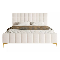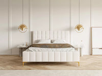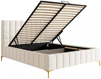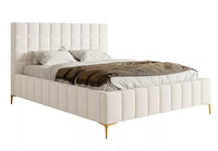 Miegamojo lova AURI, smėlinės spalvos – šilta ir jauki, dekoruota stačiakampiais dygsniais. Metalinis stelažas su dujiniais pakėlėjais leidžia lengvai pakelti čiužinį ir pasiekti erdvų patalynės skyrių; aukštos auksinės kojelės suteikia interjerui lengvumo.